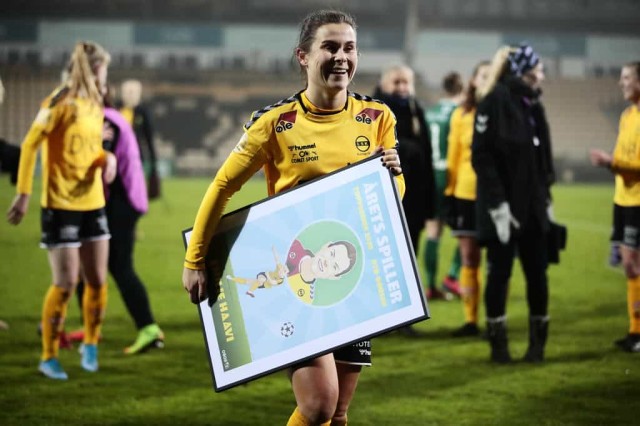 Emilie Haavi con il premio di calciatrice dell'anno in Norvegia. Fonte foto: Toppserien.no